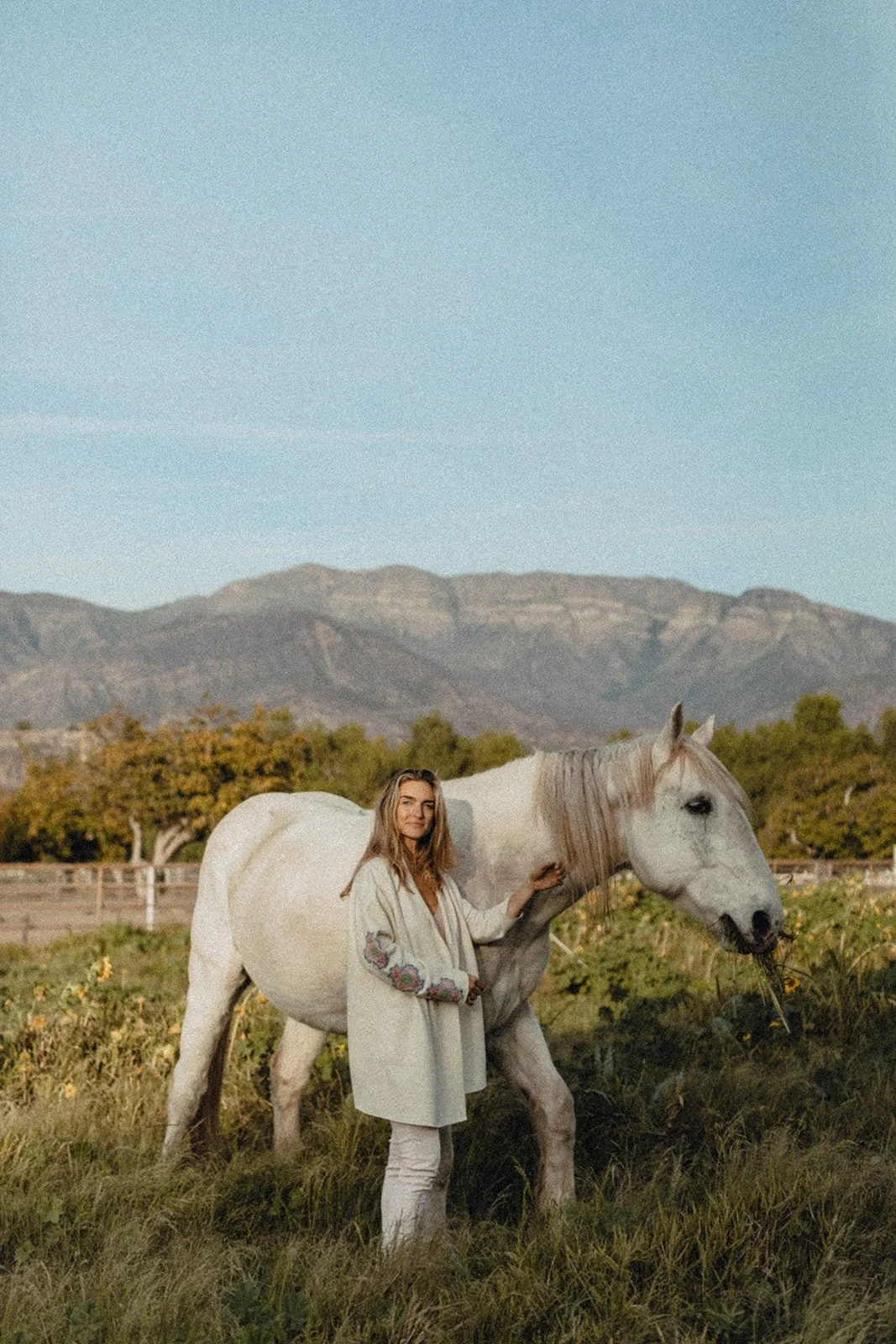 In 2018 she founded Two Moons Ranch, a horse sanctuary and creative refuge on her family’s land in upstate New York, where she has rescued and rehabilitated over a dozen horses. Through her work, she bridges the worlds of equine wisdom, systemic constellations, and feminine leadership — guiding others into deeper relationship with land, lineage, and the unseen.